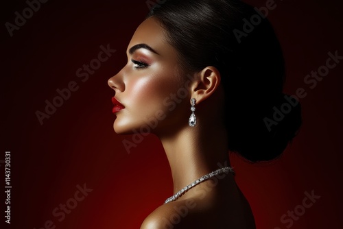 Elegant woman profile view dark hair flawless skin glamorous jewelry diamond necklace