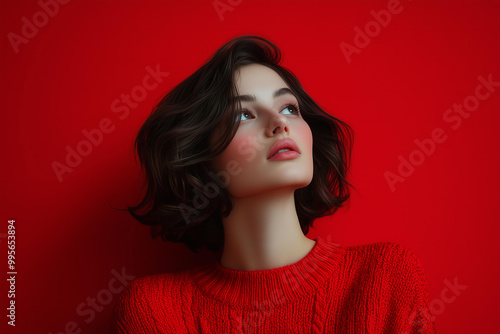 elegant woman with a wavy bob hairstyle, wearing a red sweater, posing in front of the camera and looking up to her right side with a dreamy mood , against a solid red color background
