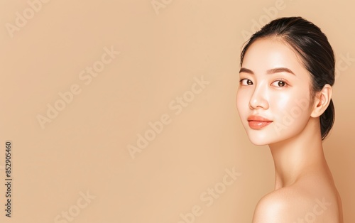 Elegant woman with flawless skin and minimalist makeup posing on a beige background. Beauty, skincare, and natural makeup concept.
