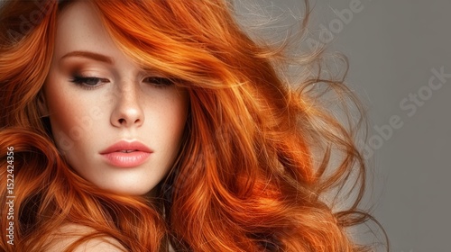 Elegant woman with flowing red hair in vibrant color, posing for a fashion magazine portrait shoot