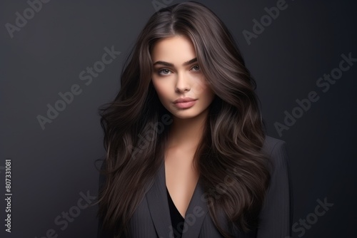 woman, portrait, beauty, fashion, model, glamour, dark hair, long hair, wavy hair, make-up, elegant, serious, confident, professional, studio, black background, head shot, high-end, stylish, sophisticated, female, adult, brunette, formal, poised, posh, chic, alluring, refined, captivating