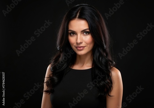 woman, portrait, beauty, hair, smile, person, face, model, professional, black background, brunette, dark hair, elegant, female, young, attractive, long hair, wavy hair, coiffure, make-up, cosmetic, skin, skincare, natural, confident, fashion, style, classic, simple, isolated, copy space, brown eyes, eye, lip, shoulder, blacktop, dark, background, one person, business, corporate, glamour, sophisticated, healthy, wellness