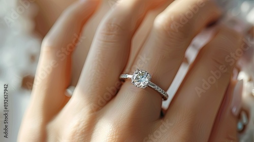 Elegant woman's hand adorned with a diamond ring, ideal for business entity promotions and wallpapers