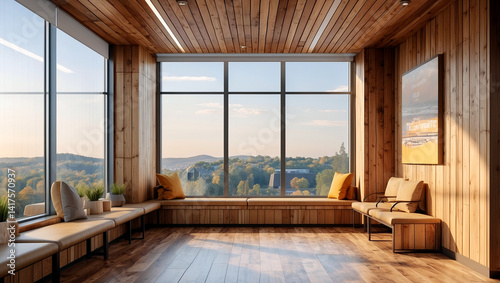 Elegant wooden office interior with panoramic view