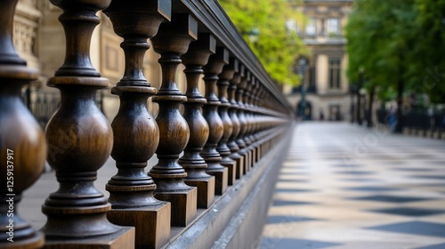 Elegant Wooden Railing along a Paved Pathway Surrounded by Lush Greenery : Generative AI