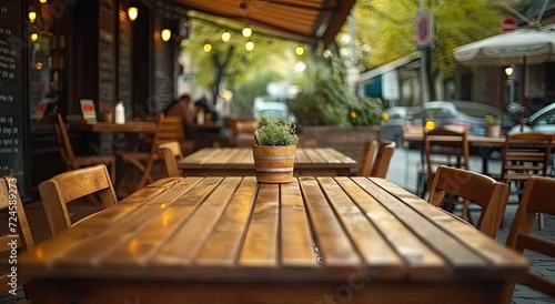 Elegant wooden table in restaurant with blurred bokeh background. Vintage cafe ambiance with cozy interior design. Abstract business setting in pub with retro decoration perfect for dining
