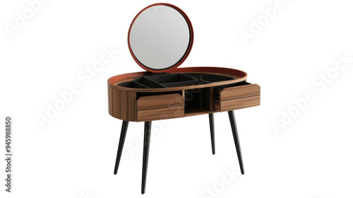 vanity, mirror, wooden, storage, modern, furniture, interior, design, home, decor, stylish, elegant, round, compartment, black, leg, contemporary, beauty, make-up, dressing, table, sleek, minimalist, functional, oval, chic, craftsmanship, luxury, organisation, bedchamber, living room, home office, versatile, practical, aesthetic, smooth, polished, warm, rich, brown, colours, unique, eye-catching, decorative, compact, high-quality, trendy, fashionable