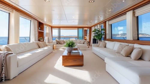 Elegant Yacht Interior with Large Windows Showcasing Scenic Ocean View and Comfortable Seating Arrangement for Relaxation and Entertainment