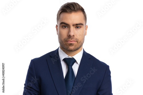 man, guy, young, fashion, posing, portrait, model, businessman, business, suit, navy blue, elegant, attaching, wearing, white, background, isolated, standing, holding, hand, attractive, photogenic, beard, unshaved, looking