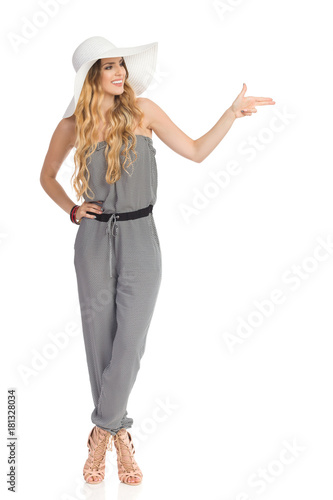 Elegant Young Woman In Sun Hat And Jumpsuit Is Showing Pistol Hand Sign