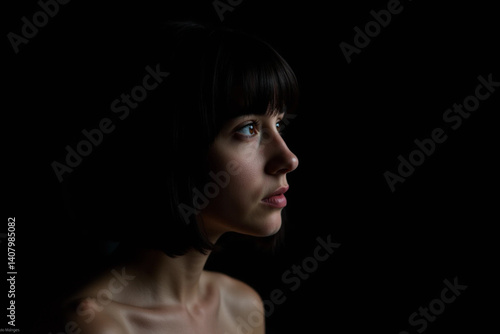 Elegant Young Woman Profile Portrait Against Black Background – Dramatic Lighting