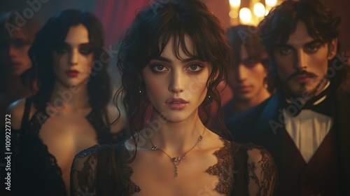 Elegant young woman with intense gaze surrounded by mysterious people in a vintage-style setting.