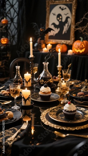 Elegantly Spooky: A Halloween Feast with Black and Gold Accents, Featuring Candles, Pumpkins, and Decadent Cupcakes Placed on a Gleaming Table, Creating a Festive Atmosphere