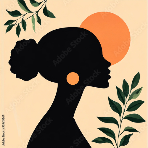 silhouette, woman, nature, plant, orange, sun, earring, black, background, art, minimalism, elegance