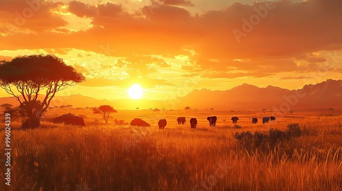 sunset, savanna, horizon, sky, cloud, mountain, hill, sun, gold, orange, red, yellow, light, warm, african, wildlife, elephant, herd, silhouette, tree, bush, grass, landscape, nature, travel, adventure, scenery, beauty, majestic, peaceful, tranquil, huge, wilderness, wild, animal, mammal, tropical, summer, evening, dusk, twilight