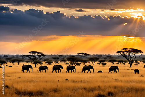 Elephant of wildebeest at sunset in savannah