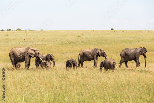 Elephants at a watering hole on the savanna in Masai Mara