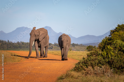 elephant, wildlife, wilderness, south africa, morning, landscape, dirt road, africa, african, animal, blue, day, daylight, grass, mammal, mountain chain, mountain, nature, outdoors, park, plant, reserve, safari, savanna, sky, sunrise, travel, wild