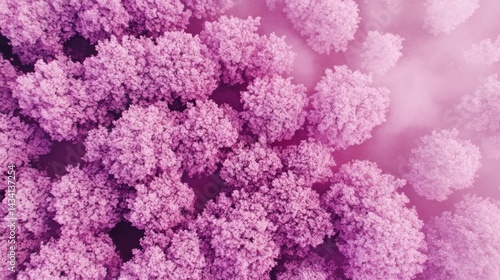 aerial, view, forest, tree, purple, pink, colours, vibrant, nature, landscape, canopy, top, down, foliage, dense, cluster, rounded, top, growth, environment, beauty, natural, image, photo, detail, texture, pattern, symmetry, light, shadow, mist, haze, atmosphere, coloration, bloom, wood, nature, flora, high-coloured, pale, pastel