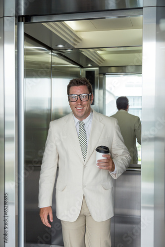 caucasian, man, male, adult, brunet, person, photogenic, 40, attractive, modern, lifestyle, business, businessman, businessperson, manager, look, professional, formal, corporate, employee, 1, specialist, executive, job, workplace, white-collar, goggles, eyewear, office, holding, indoor, smiling, positive, cheerful, toothy, middle, hot drink, drink, break, rest, cup, elevator, walk, concept, career, morning, reflections, optimistic, lift