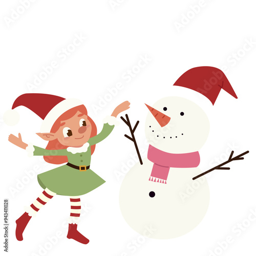 elf, girl, snowman, christmas, winter, holiday, snow, festive, fun, joy, play, celebration, tradition, red, green, white, cartoon, illustration, cheerful, whimsical, character, childhood, seasonal, cold, foulard, activity, cute, fantasy, happy, greeting, happiness, funny, background, decoration, merry, claus, year, vector, hat, card, eve, isolated, laughing