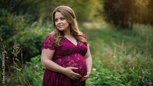 ai, woman, pregnancy, maternity, nature, peaceful, joy, anticipation, motherhood, happiness, sunset, golden hour, burgundy, tree, field, summer, serene, female, adulthood, content, thoughtful, reflective, beauty, life, creation, nurture, calm, gentle, pose, glowing, warm, tranquil, park, greenery, soft light, mother-to-be, caress, belly, precious, elegance, grace, fertile
