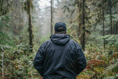 Embracing Nature: Plus-Size Man Engaging in Forest Bathing to Reconnect with the Environment in Misty Woodland