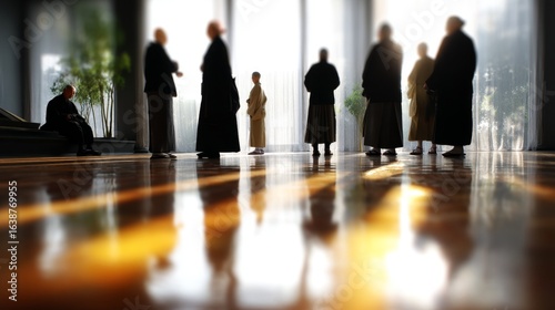 Embracing Sacred Knowledge: Visitors Engage in Religious History Exhibition under Morning Light, Dreamy Focus, High-Angle View