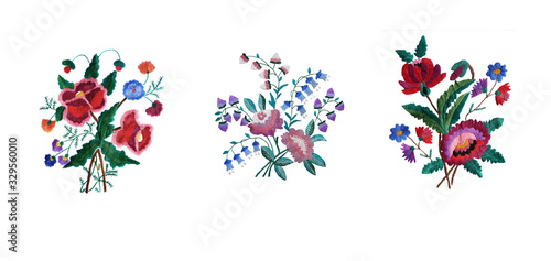 Embroidered three bouquets of flowers. Ukrainian folk hand embroidery. isolated.