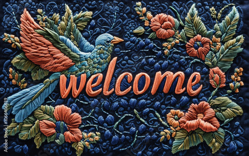 embroidered, abstract, text, welcome, wool, threaded, thread, knit up, textile, colours, craft, colourful, red, texture, cotton, sewing, yellow, string, blue, green, embroidery, macro, rope, pattern, crochet, knit up, fabric, material, white