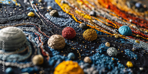 embroidery art, depicting a galaxy, planets and stars, intricate thread work