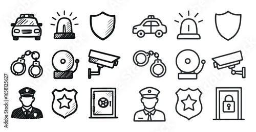emergency, security, police car, siren, shield, handcuff, guard, badge, vector, flat, monochrome, graphic, rough, line, icon, simple, vignetting, linear, isolated, minimal, outline