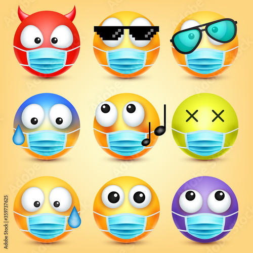 Emoticons, emoji vector collection. Cartoon yellow face with medical mask. Facial expressions and emotions.
