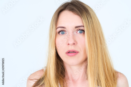 emotion, face, overwhelmed, perplexed, shocked, surprised, astounded, woman, young, beautiful, blond, girl, portrait, white, background, mood, feeling, amazed, thunderstruck, dumbfounded, flabbergasted, expressive, personality, people, person, caucasian, adult, facial, expression, free space, copy space, copy space
