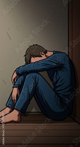 Emotional Despair: A lonely person in a depressed state, with a tense face, is sitting on the floor, leaning against a wall. Despair, anxiety, and stress are on the verge of breaking out.