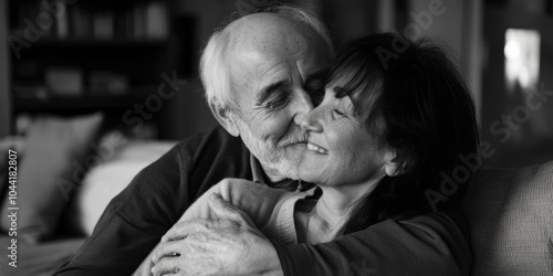 elderly, couple, older, man, woman, loving, hug, indoor, setting, emotional, bond, home, environment