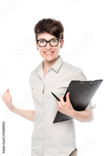 emotional happy woman with glasses successful in business, portr