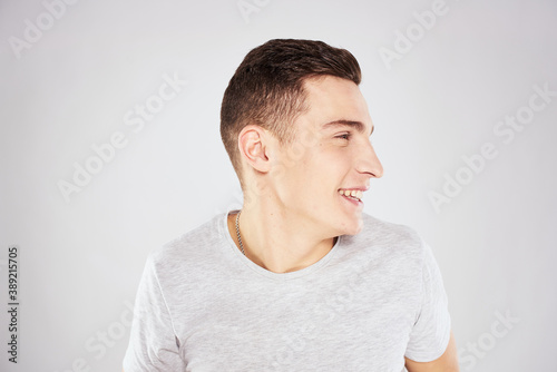 Emotional man in white t-shirt cropped view on blue background lifestyle