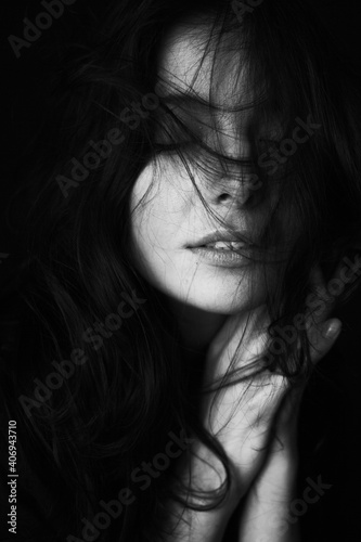 Emotional Sensual black and white portrait of a beautiful girl on a dark background