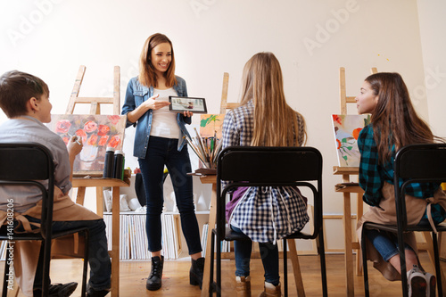 occupation, art, device, school, lesson, topic, joy, fine art, project, childhood, contemporary, visual, artist, enjoyment, inspiration, technique, generation, professional, teaching, class, workshop, tablet, full-length, modern, wireless, cyberspace, colours, gouache, happy, cheerful, involved, happiness, easel, children, gifted, positivity, education, hobby, weekend, talent, young, several, creative, instructing, learn, painting