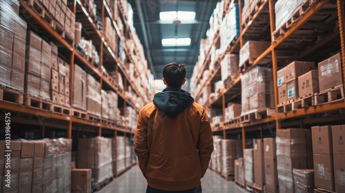 Employee examining the arrangement of goods on racks, large warehouse, back view
