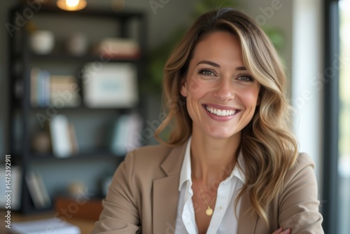 Empowered Life Coach Radiates Confidence: A Powerful Image of a Smiling Woman in her Office
