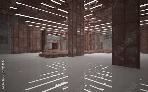 Empty abstract room interior of sheets rusted metal, brown concrete and white glossy floor. Architectural background. 3D illustration and rendering