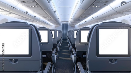 aeroplane, cabin, overhead, seat, screen, bin, travel, flight, transport, journey, luxury, interior, economy, class, air, airline, passenger, comfort, aircraft, transportation, business, vacation, leisure, holiday, modern, empty, clean, white, grey, black, design, template, seat, monitor, airliner, aviation, sky, tour tourism, service, entertainment, technology, display, blank, window, wing, aisle