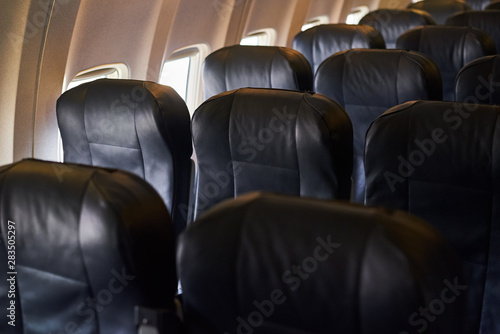 Empty airplane passenger seats in airplane. A plane interior