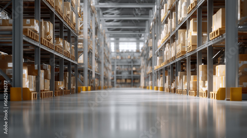 empty, aisle, modern, warehouse, stacked, cardboard, box, tall, shelf, blurred, industrial, background, large, clean, floor, space, foreground, branding, text, copy, storage, logistic, supply, chain, distribution, center, stock, inventory, cargo, good, transport, cardboard box, freight, depot, storehouse, factory, infrastructure, fulfillment, merchandise, organisation, shelving, pallet