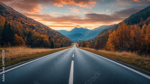 Empty Asphalt Road Through Autumnal Mountain Valley at Sunset