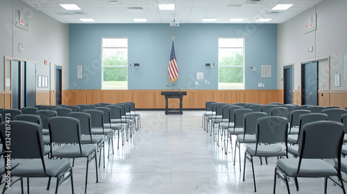 Empty Auditorium With Rows Of Chairs Facing The American Flag And Podium Interior Lighting Through Windows