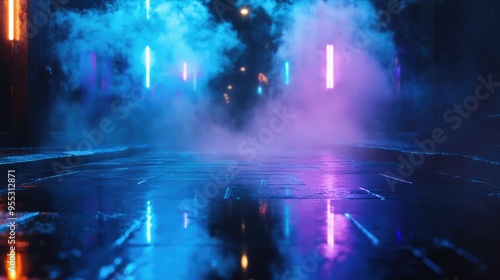 Empty backdrop scene featuring dark street reflections on wet pavement Neon light rays illuminate the darkness creating abstract shapes amidst smoke