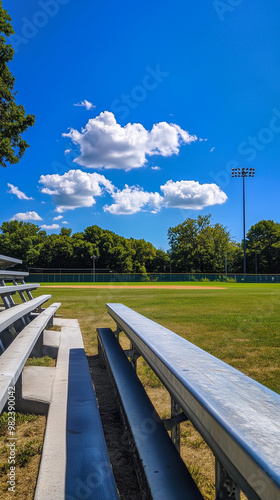 Empty baseball field metal bleachers green grass blue sky summer outdoor sports stadium seating recreational park rural nostalgic classic game day